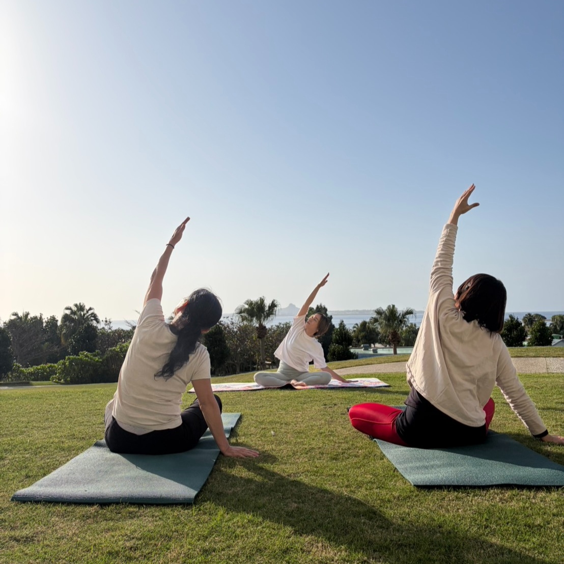 スパ「琉水」では、毎週日曜日、ホテルの中庭にて初心者の方や小さなお子さまも安心してご参加いただける朝のウェルネスプログラム「朝ヨガ」を開催しています。