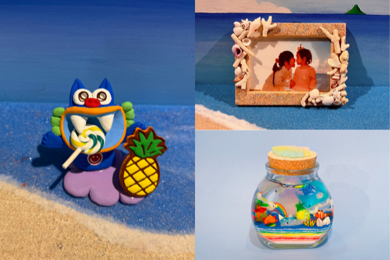 シーサーやジンベエザメ、マンタを自由に彩る絵付け体験や、ジェルキャンドル、フォトフレーム作りをお楽しみいただけます。